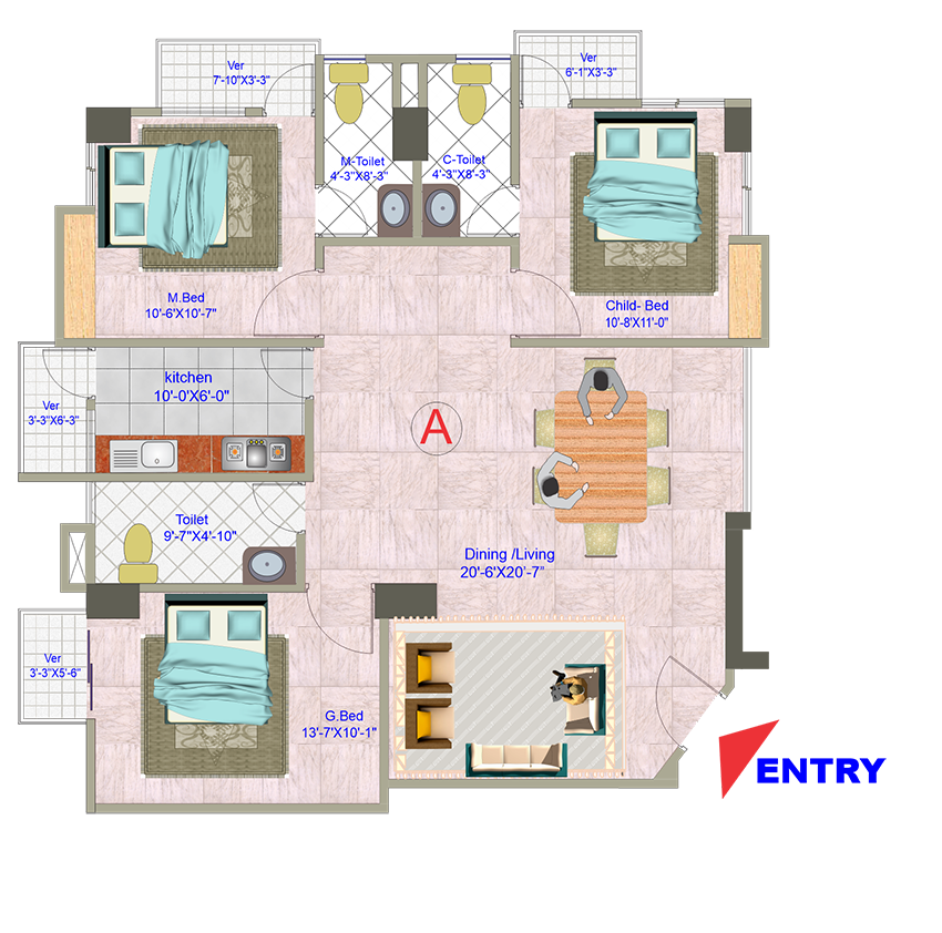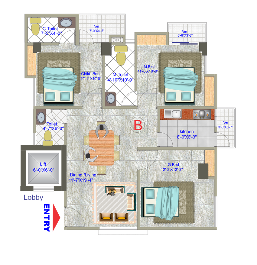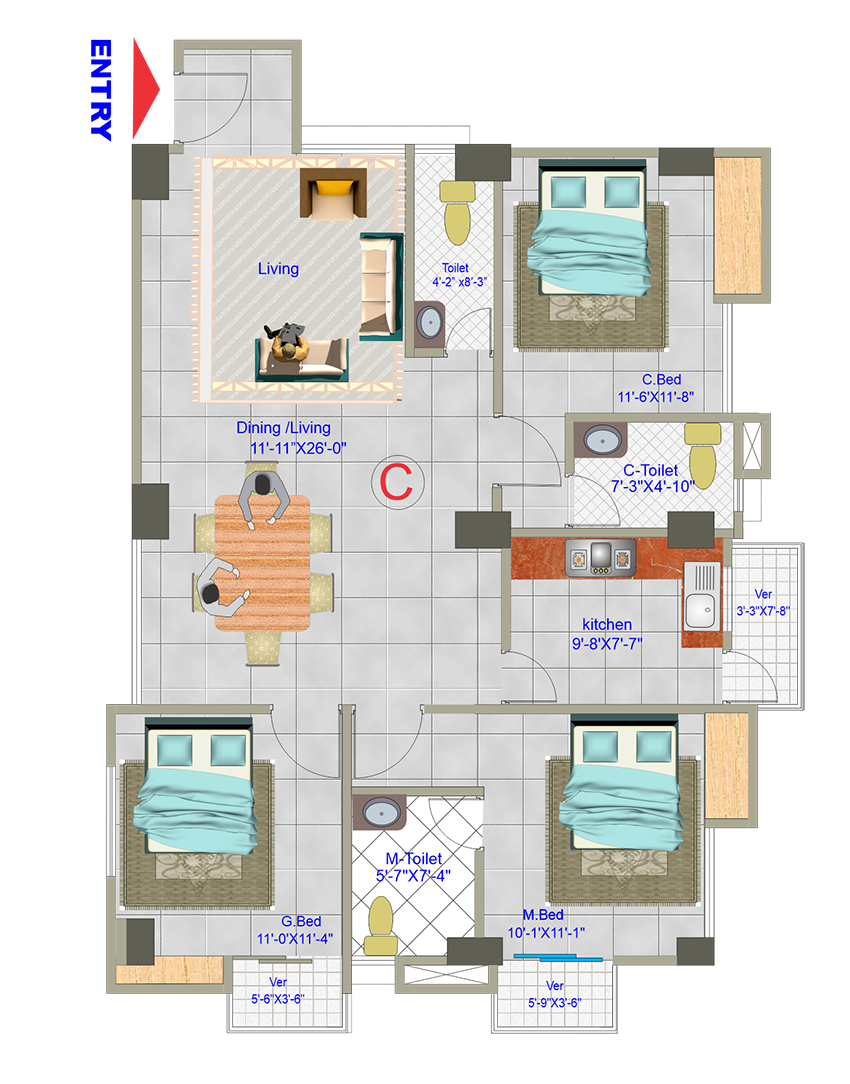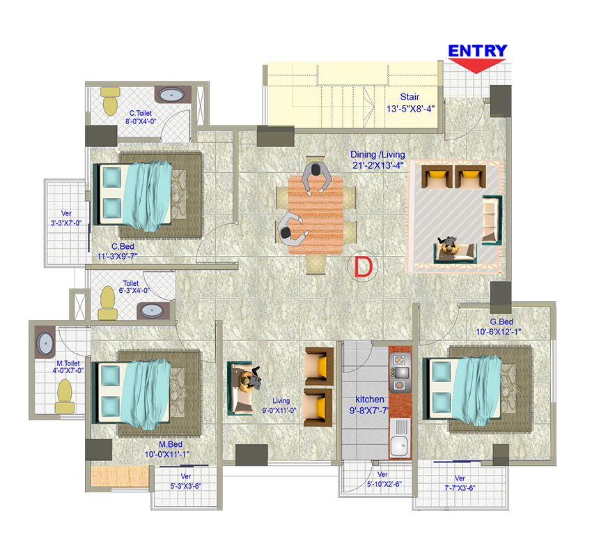 Type | Size | Bedrooom | Bathroom | Verandha |